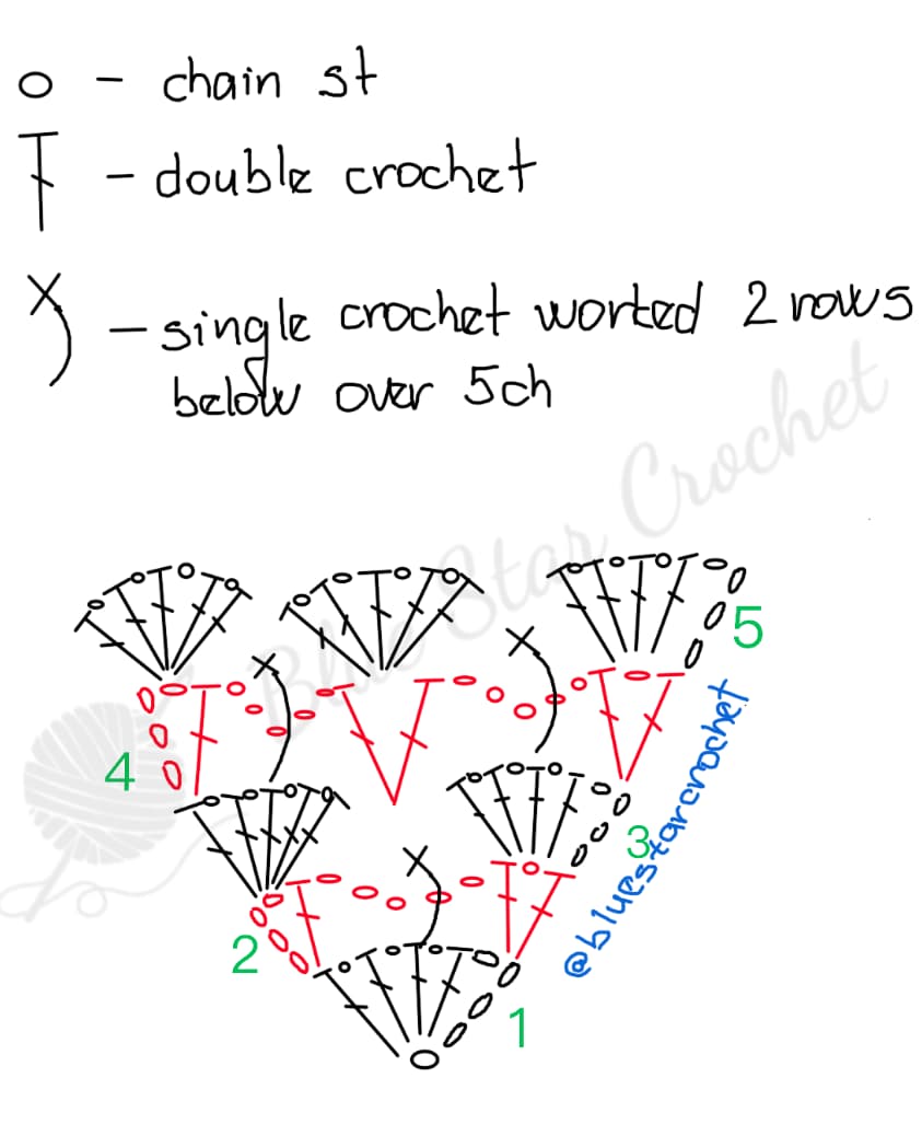 1 shell = [(1 dc, 1 ch) 4 times, 1 dc] in same space