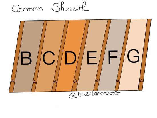 - there are 7 sections of the pattern from A to G, section A is repeated after end of each section and on both ends of the shawl